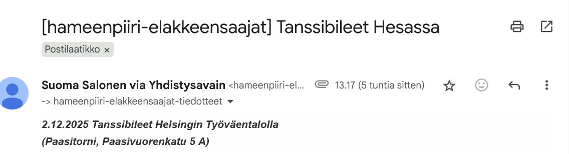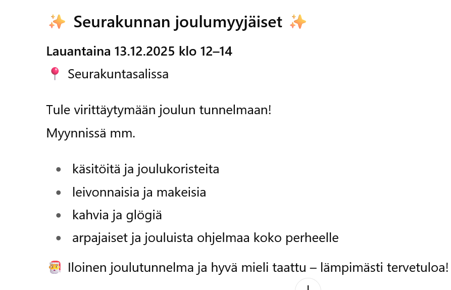 Pikkujoulu viikolla 49, perjantai 5.12.2025 Pentinkulmassa. Jouluruokailu, hinta jäsenille 30 €. Viimeinen ilmoittautumispäivä 31.10.2025, eräpäivä 21.11.2025,HUOM ! ei matka vaan yhdistyksen tilille…