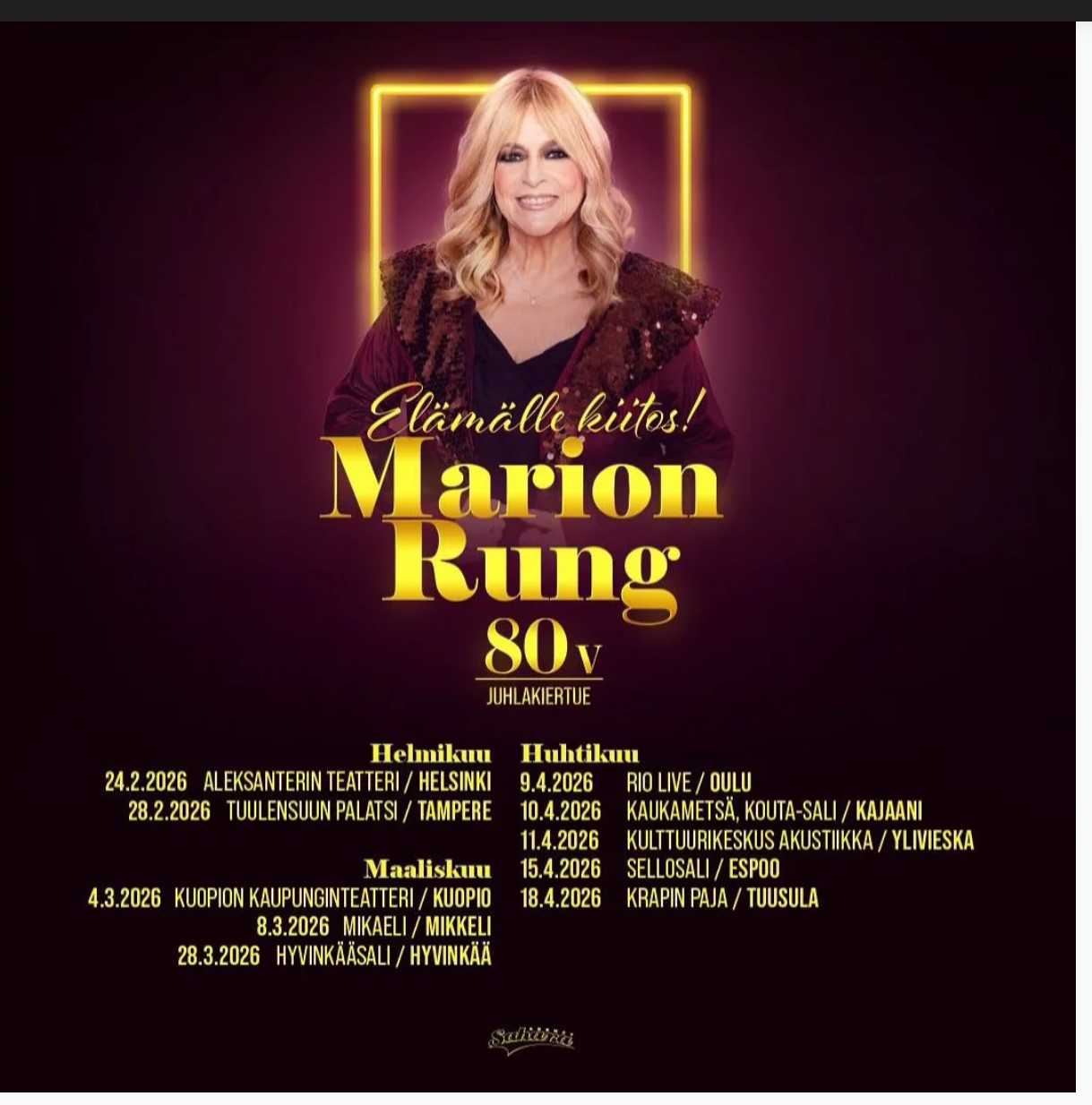 Marion Rung : 80-vuotisjuhlakonsertti 28.2.2026 klo 18 Tampereella Tuulensuun palatsissa. Tänne on varaus tehty ja se pitää vahvistaa 20.1.2026. Ilmoittautumiset tänne viimeistään 19.1.2026.…