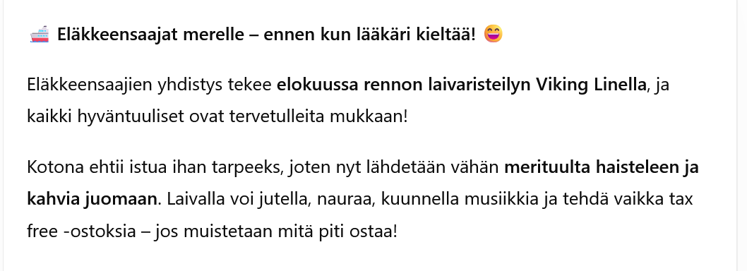 Eläkkeensaajat merelle - ennen kun lääkäri kieltää !